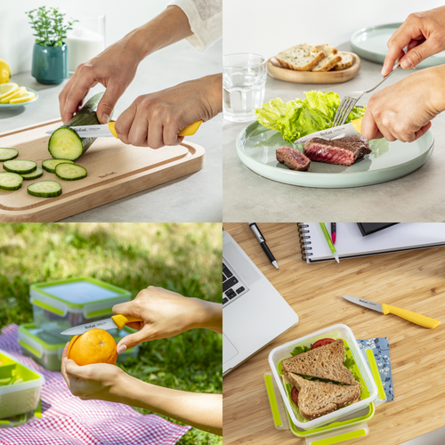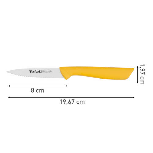 Το μαχαίρι Tefal Colorfood με οδοντωτή λεπίδα είναι βολικό σε πολλές περιστάσεις — για το πρωινό όταν κόβετε φρούτα ή ψωμί, στο γεύμα για προετοιμασία λαχανικών ή κρέατος, για να κόψετε σνακ σε κοκτέιλ και πολλά άλλα.