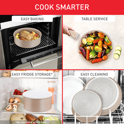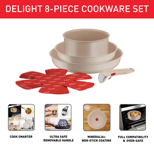Η Tefal Delight προσφέρει ένα σετ υψηλής απόδοσης που συνδυάζει υγιεινά αποτελέσματα με αδιαπραγμάτευτη γεύση. Από βελούδινη μπεσαμέλ και καπνιστή σάλτσα μπάρμπεκιου μέχρι μουστάρδα με μέλι, μαγειρέψτε με τις καλύτερες καινοτομίες της Tefal, σε συνδυασμό με ανθεκτικά υλικά και σχεδιασμό που ακολουθεί τις τελευταίες αισθητικές τάσεις, συμπεριλαμβανομένου ενός σώματος κατασκευασμένου από 100% ανακυκλωμένο αλουμίνιο. Η αντικολλητική επίστρωση Mineralia+ προσφέρει τέλεια ολίσθηση σε κάθε γεύμα, χωρίς να αλλοιώνει την υφή ή τη γεύση των συστατικών σας, και άψογη απελευθέρωση για μαγείρεμα χωρίς προσθήκη λίπους ή λαδιού. Ολοκληρώνοντας το πακέτο, η τεχνολογία Thermo-Signal™ της Tefal, που εξαλείφει τις εικασίες από το μαγείρεμα υποδεικνύοντας την ιδανική θερμοκρασία έναρξης μαγειρέματος, συνδυάζεται με μια βάση Thermo-Fusion™ για ομοιόμορφη κατανομή της θερμότητας σε όλο το τηγάνι. Η Delight είναι η ιδανική σειρά για υγιεινές συνταγές μαγειρεμένες στην εντέλεια.